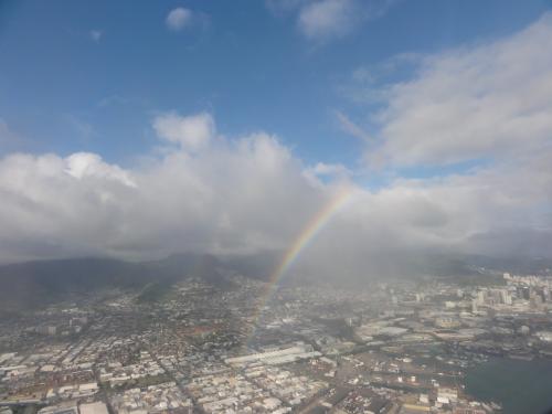 空から虹を見たのは初めて。しかもダブルレインボー! 濃い虹の左側にもう一本あるよ。
