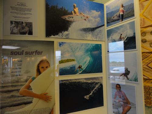 空港内に飾られたカウアイ島出身の女性サーファーのパネル。よく見ると片腕。
