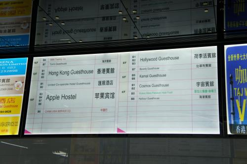 Middle Road / Nathan Road bus stopで下車し、大通りを歩いて3分。正面に大きな電光掲示板があるのが重慶大厦。このビル内部にある蘋果賓館-Apple Hostel(US$25/night)にチェックイン。