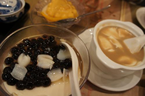 香港といえばスイーツ!涷寶(黒タピオカ・$30)、芒果布甸(マンゴープリン・$20)花合(豆腐花とアーモンドミルク・$23)。