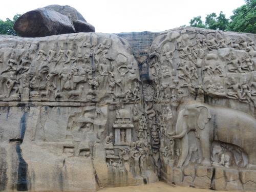 幅29m、高さ13mの岩に彫られた「アルジュナの苦行」は世界最大のレリーフとも言われる。神の詩「バガバッド・ギーター」をご存知の方なら「アルジュナ」という名ににピーンと来るだろう。