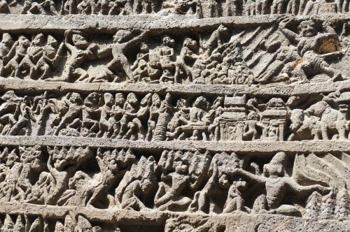 寺院外壁にはシヴァ神にまつわる神話のほか、「マハーバーラタ」「ラーマヤーナ」の場面が至るところに浮き彫りされている。