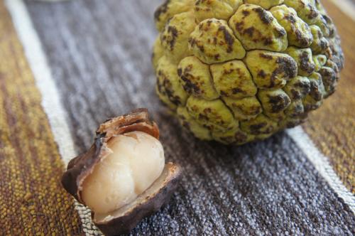 茶色の殻をむいて出てきたのは栗みたいな味(左)。緑色のはカットすると甘い果肉が(右)。