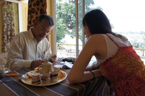 Lakeside Hotel オーナーAvinash Tiwanさん(上)は過去何度か来日しており日本語堪能で親日家。ウェルカムチャイとクッキーでもてなしてくれた。その後、Yummyと今までの旅の経過を報告し合い、ランチに出かけることにした。