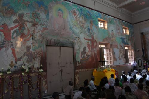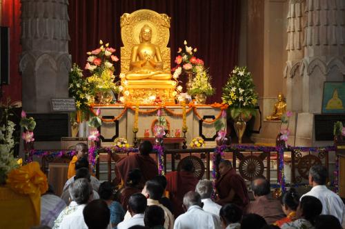 正面奥には金釈迦如来像が祀られ、世界各国から僧侶や巡礼者が訪れて説法を聞く風景が見られる。最前列のオレンジに赤紫色のショールを纏うのが僧侶。また、公開されていないがブッダのご遺骨が納められているとの話も?
