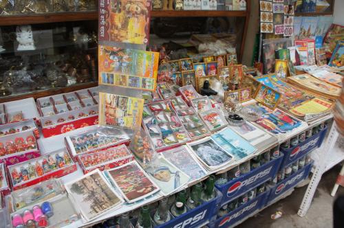 シヴァやクリシュナ、ラクシュミなどヒンドゥー教の神様グッズが並べられている。