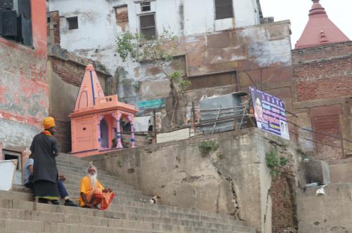 ガートで休む彼らは俗世を捨て施しを受けながら行脚を続ける住所不定無職のサドゥー。ヨーロッパから来たバックパッカーの中にはサドゥーの生き方をリスペクトする人も?汚い恰好、髪や髭ボーボーのヒッピー風の姿で牛のウ○コがそこらじゅうに落ちているバラナシの街を裸足で歩く。ビザが切れ母国に戻ったら社会復帰が難しいだろう。