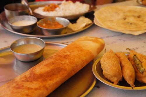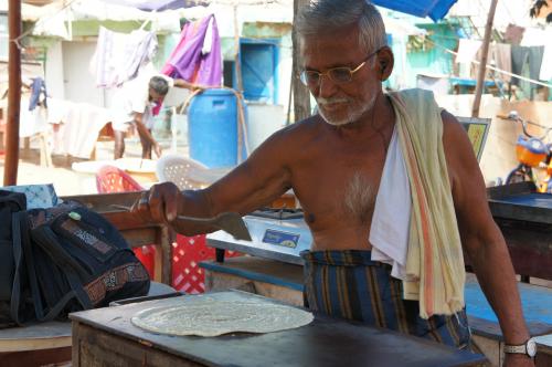バザールの食堂でブランチ。おっちゃんは器用にドーサ生地を作る。