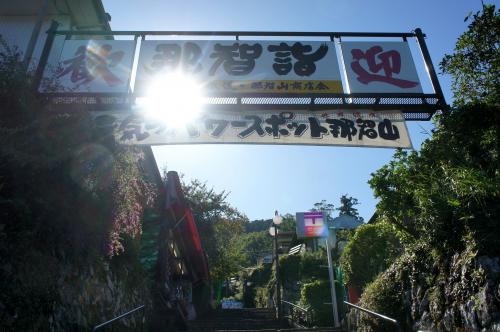 上りきると、那智大社へ続く階段が。「元気の源パワースポット那智山」