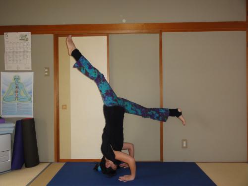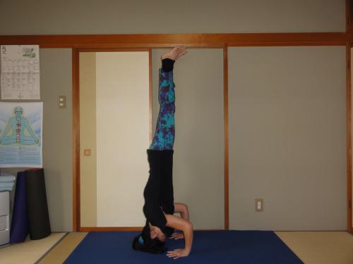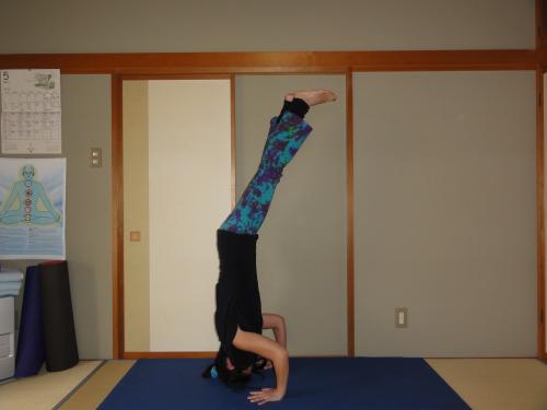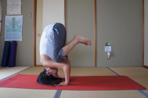 ④静止して5回呼吸します。何か月もかけて定期的に練習し、最終的には5分から10分静止できるようにします。倒立と逆の手順でポーズを解き、その後子供のポーズで身体を休めます。(参考文献:ヨーガバイブル)